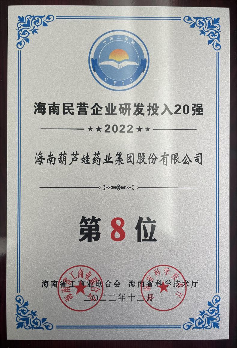 12月23日,2022海南民营企业50强和研发投入20强发布会在海口举行。会上发布了“2022海南民营企业50强”“2022海南民营企业研发投入20强”榜单和分析报告。威客电竞药业再次荣登两榜,在海南民营企业50强榜单中位列第25位,较去年上升8位,这也是公司连续三年登榜;在海南民营企业研发投入20强中位列第8位,较去年上升7位。